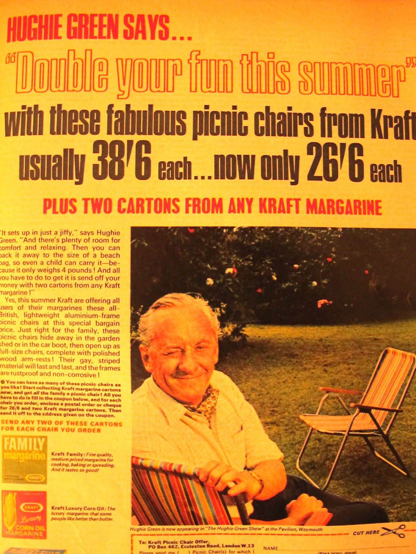 Most interesting, though, are the adverts.  Not a single mascara or anti-wrinkle cream in sight.  OK, so Woman’s Realm of July 23rd 1966 is obviously not aimed at the most fashion conscious of readers but the only concession to looks is an advert for H. Samuel jewellers. ‘Getting engaged? It’s more fun choosing your ring at H. Samuel. You’ve such a fabulous choice?’ Other than a picture of a woman looking quietly pleased with her ‘Heart Solitaire’ (yours for £16) its readers are allowed to go unmolested by the beauty industry.  Weirdest advert was this one for deckchairs, in which Hughie Green exhorts us to save two margarine cartons to get this special deal on ‘fabulous’ pic-nic chairs, which will, he assures us, ‘double our fun’.  Is it me or is it a bit sinister?
