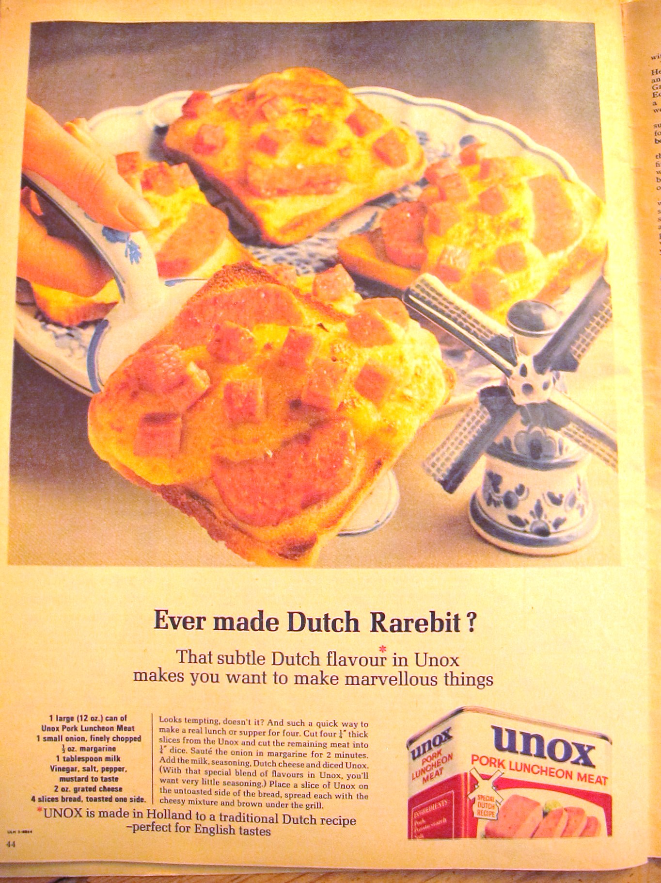 Yum.  Unox. Dutch (as illustrated by pottery windmill.  I wonder if that came free in the tin?)  I would probably not be first in the line for a slab of pork luncheon meat with or without a few pounds of melted cheese on top, but one called ‘Unox’?  Since when has something that sounds like a brand of toilet cleaner supposed to get our taste buds going?  “Sounds tempting, doesn’t it?” Not really.  Still, I suppose your Unox supper frees you up for more time to knit and enjoy ‘doubling your fun’ on your Kraft deckchair, hopefully without Hughie Green grinning across at you.