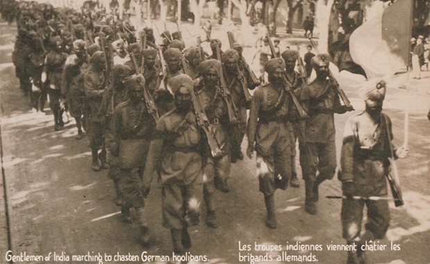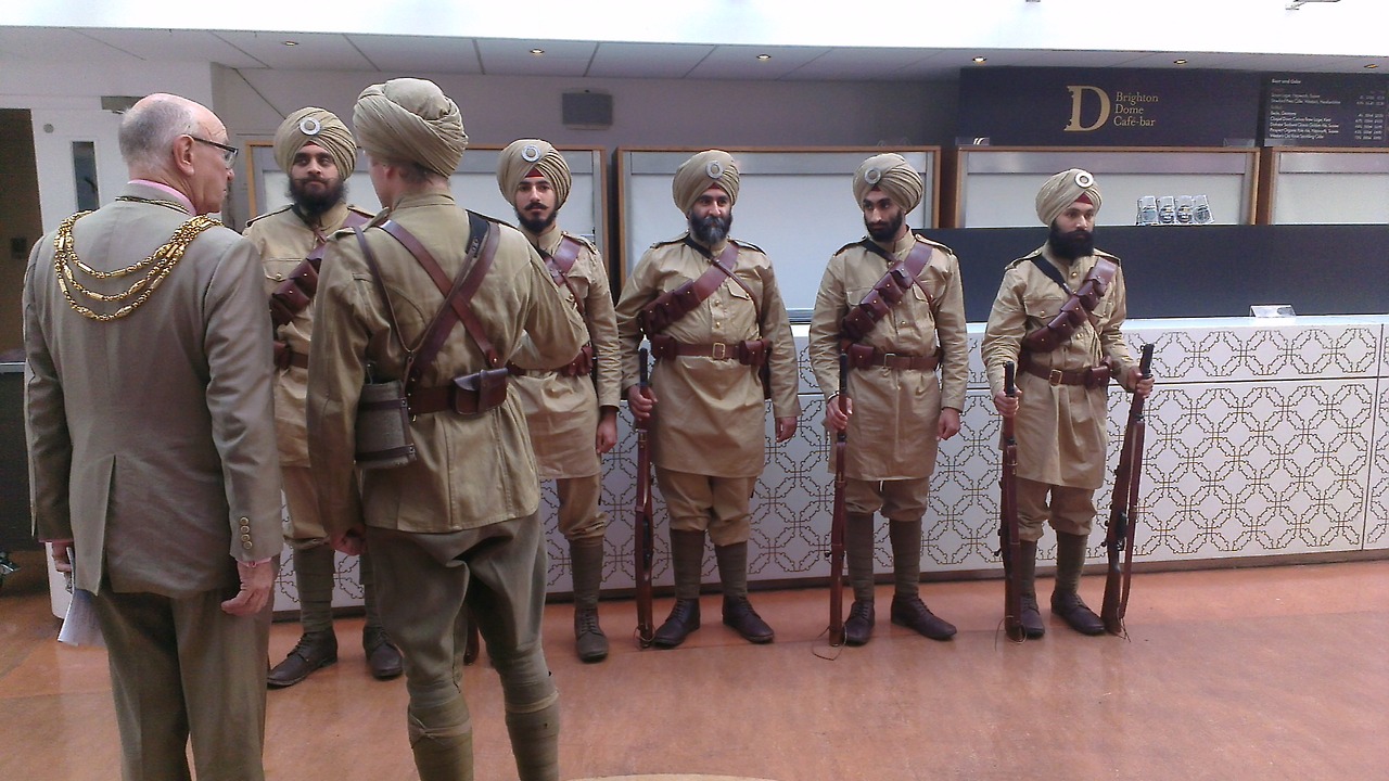 (Note the caption in French and English… ‘Gentlemen of India, marching to chasten German hooligans’.) I’ve mentioned on this blog before that 1.3 million Indians fought in the First World War, 20% of them Sikh. The Brighton connection, of course, is that the Royal Pavilion Estate, as well as other premises in the city, became military hospitals for the wounded. Here’s a picture from the Royal Pavilion and Museum’s tumblr ‘A War Story A Day from Brighton Museums’ http://brightonmuseums-ww1-war-stories.tumblr.com/ of our ‘soldiers’ being greeted by the Mayor in the Dome…