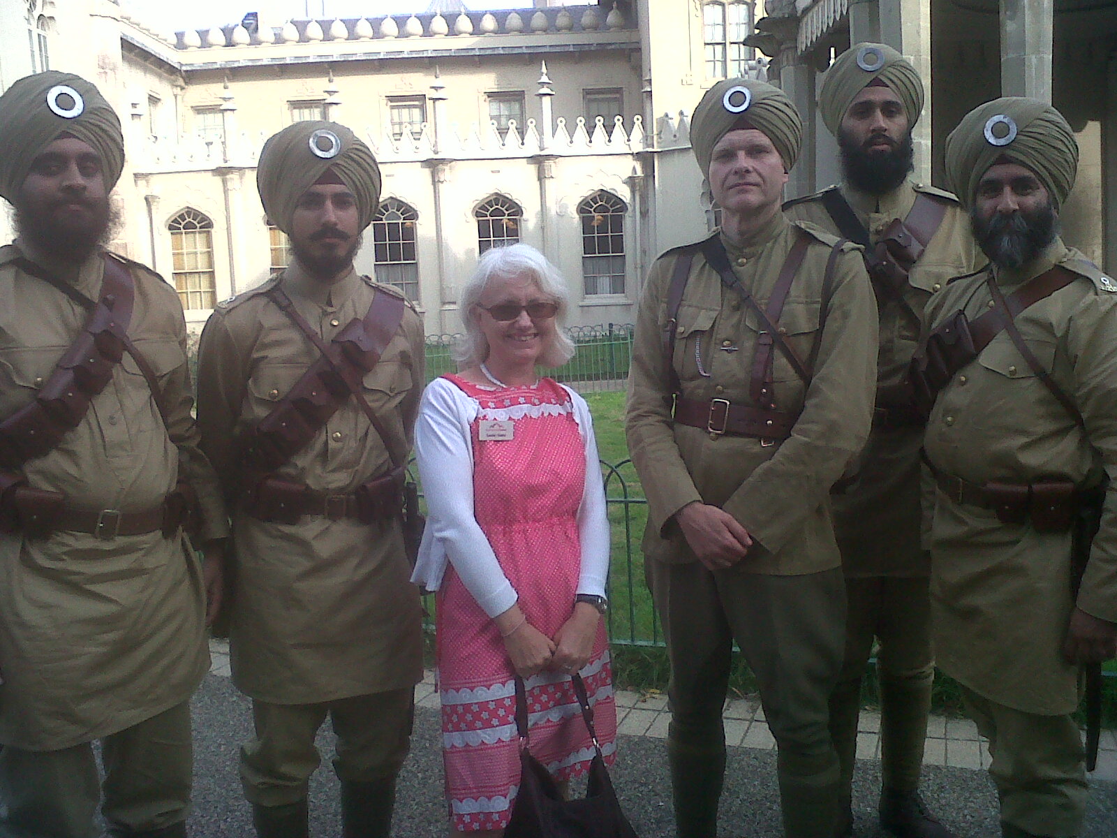 My mission on Saturday 13th September: take the 15th Ludhiana Sikh regiment on a tour of the Royal Pavilion. It wasn’t supposed to work out like that. I’d been hired to be Brighton Museum’s French speaking meet and greet for its War Stories Open Day, a real pic n mix of an event where visitors could research their First World War ancestors, listen to poetry and prose inspired by the conflict, hear wartime songs, rub shoulders with costumed characters, have a suffragette explain to you just why women should be given the vote, get close to military uniforms and kit, and generally find out more about how the years 1914 – 18 were experienced by the people of Brighton. With the hordes of French visitors conspicuous by their absence, however, and my paper Tricolor quickly wilting, it was decided to find a better use of my time. And what better use… The gentlemen in question, although looking as if they’d just stepped out of a time machine from 1914, were from the National Army Museum, part of a living history project in conjunction with the Anglo-Sikh Heritage Trail called ‘War and Sikhs: Road to the Trenches’ ‘http://www.nam.ac.uk/microsites/future/join-in/nam-about-town-country/war-sikhs/ . Made up of volunteers and staff from the National Army Museum, its aim is to ‘bring the Sikh military story to life’ by recreating a formation of soldiers from the 15th Ludhiana Sikh Regiment as they would have appeared on the battlefields of the First World War. This contemporary postcard shows them arriving in France…