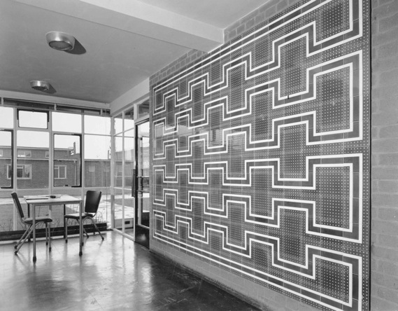Her tile work (sadly no longer there) embellished, among many, many other places, the early Heathrow and Gatwick Airports. Below is what you could have enjoyed arriving at Heathrow in 1955.